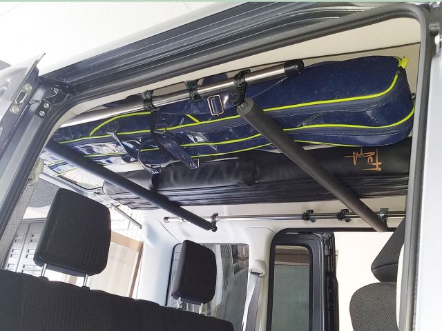片側3ヶ所で1,200ミリのステンレスパイプサイドバーを、左右に取り付ける車内キャリアタイプです。