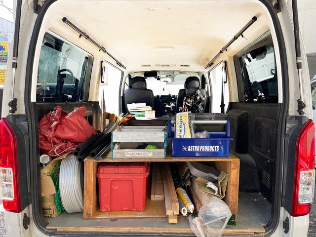 重量のある資材・クラシカルボード・オンフィンタイプのロングボードや、その他重量物を積載する場合は別売りの 200系ハイエースSGL補強パワーステー 2個セット にて補強してください。
