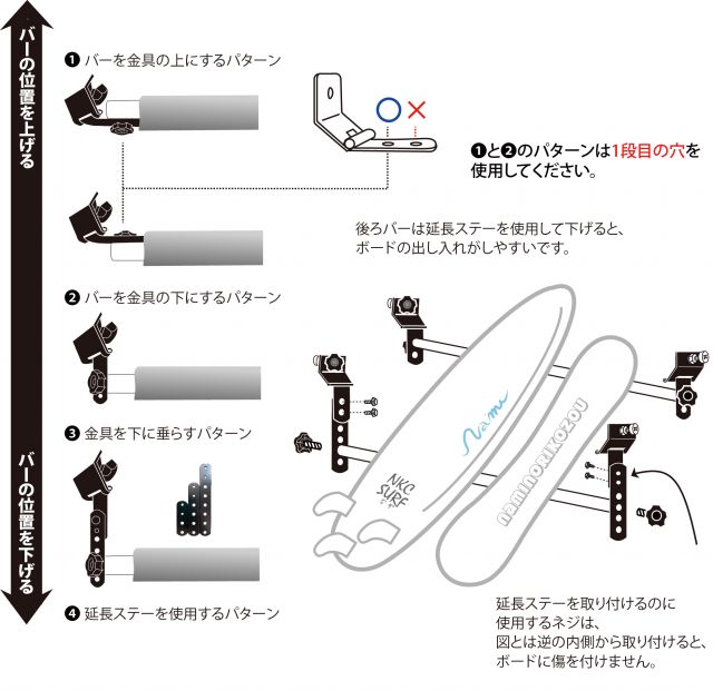 ●厚みのあるものを積載する場合、延長ステーを使用することでバーの位置を下げることが可能です。