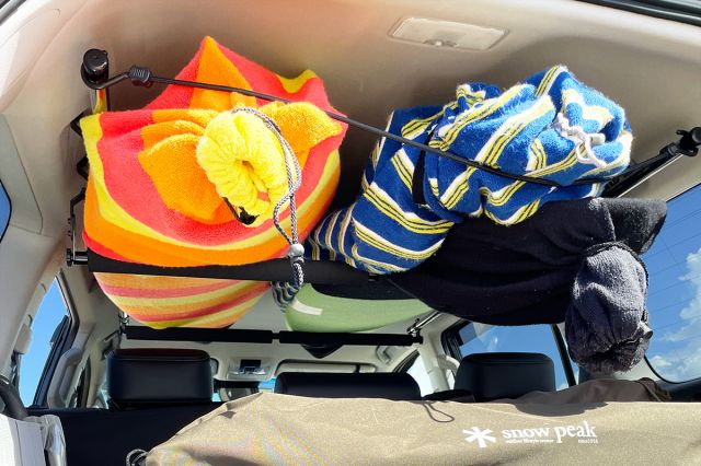 この車内ラックなら 雪山を滑った後の濡れたスノーウェアやグローブを乾かしたり、